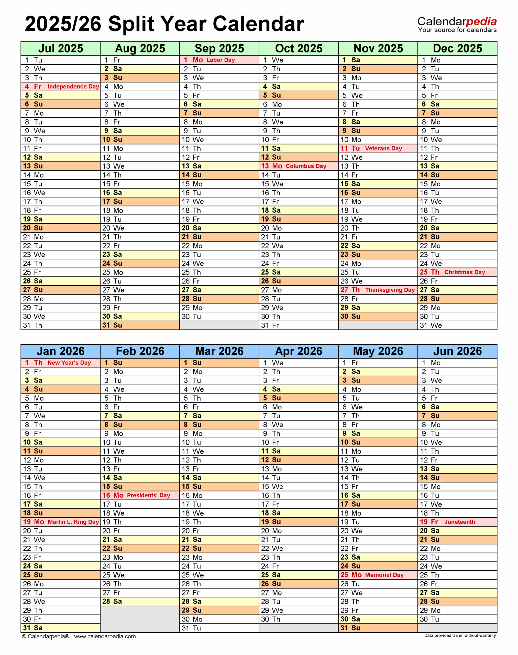 Split Year Calendars 2025 2026 July To June PDF Templates