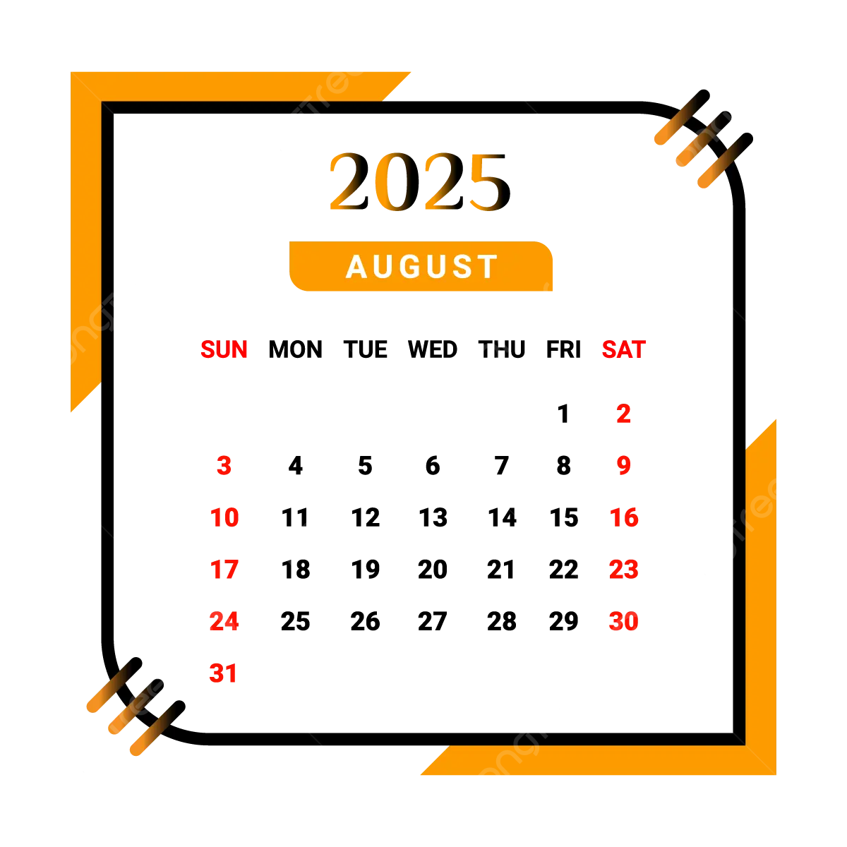 2025 August Month Calendar With Black And Yellow Vector Monthly Calendar Calendar August 2025 PNG And Vector With Transparent Background For Free Download