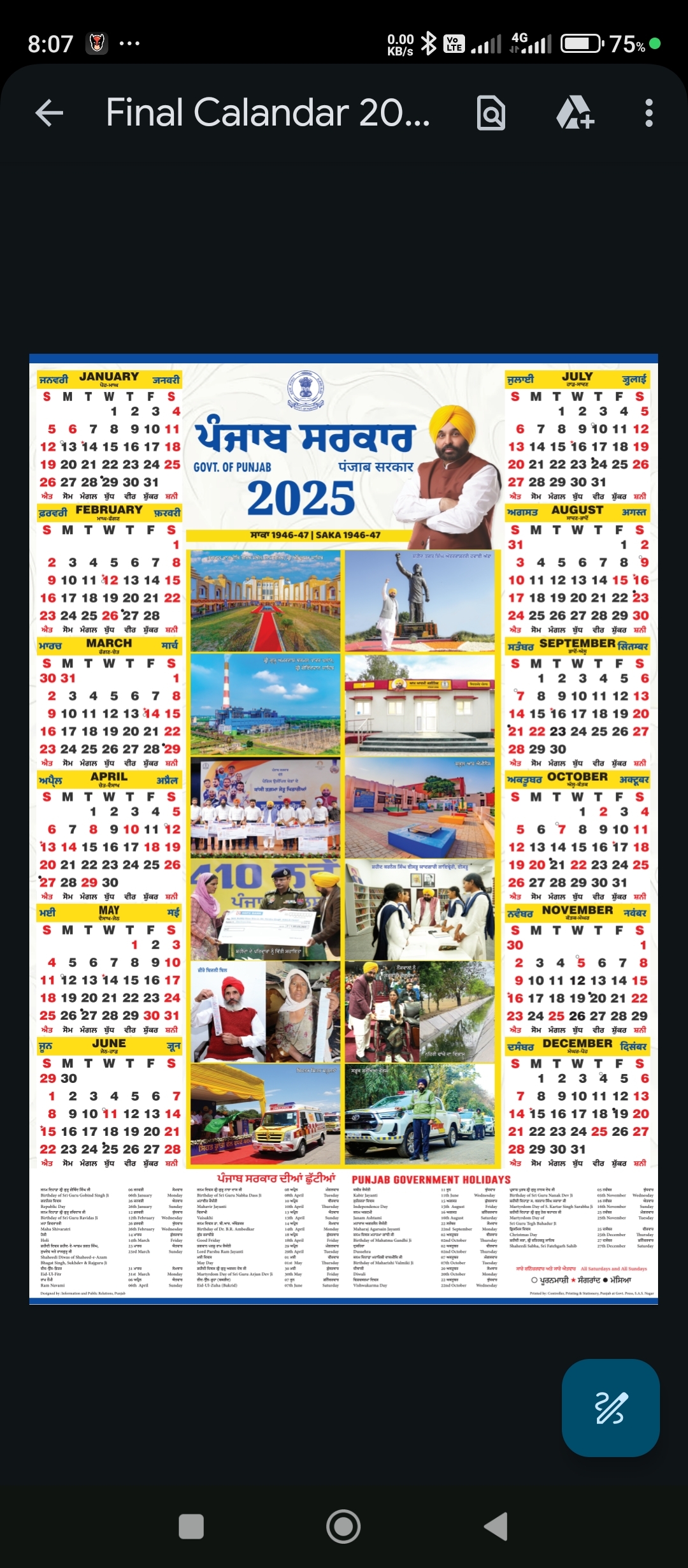 Punjab Govt Official Calendar 2025 PDF File Service Matter