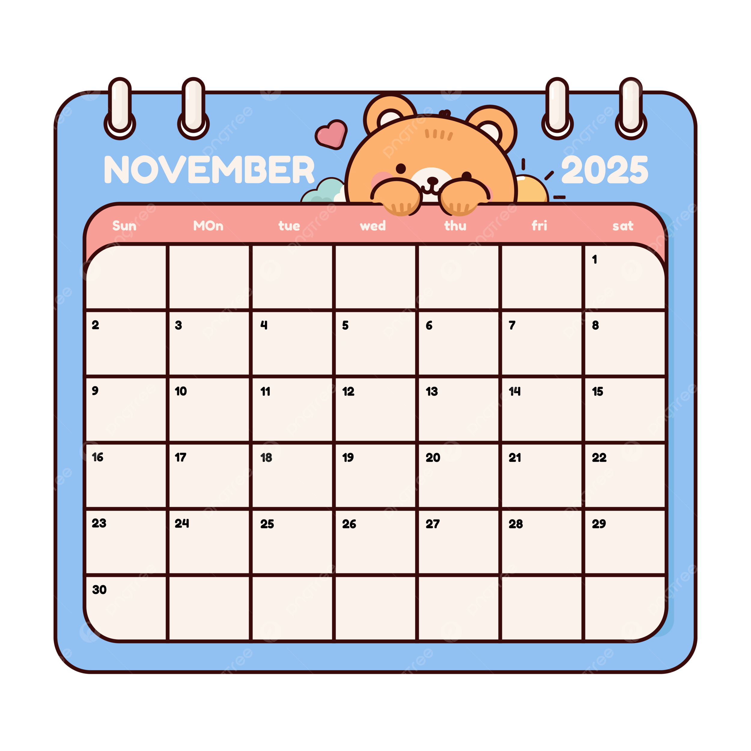 Cute Cartoon Bear November 2025 Calendar Page Wall Template