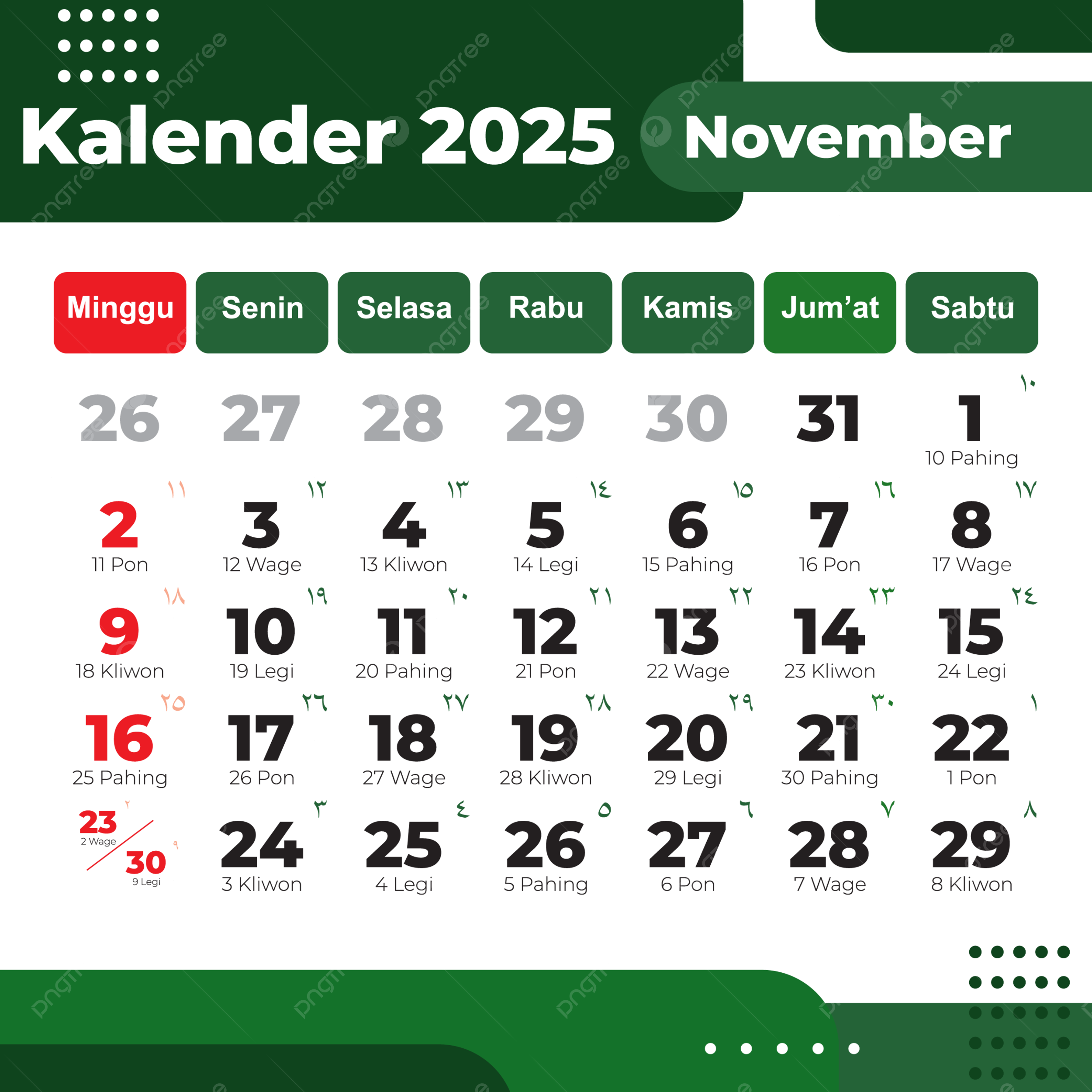 Indonesian Monthly Calendar 2025 November Complete Green Calendar Vector November Calendar 2025 Calendar November PNG And Vector With Transparent Background For Free Download