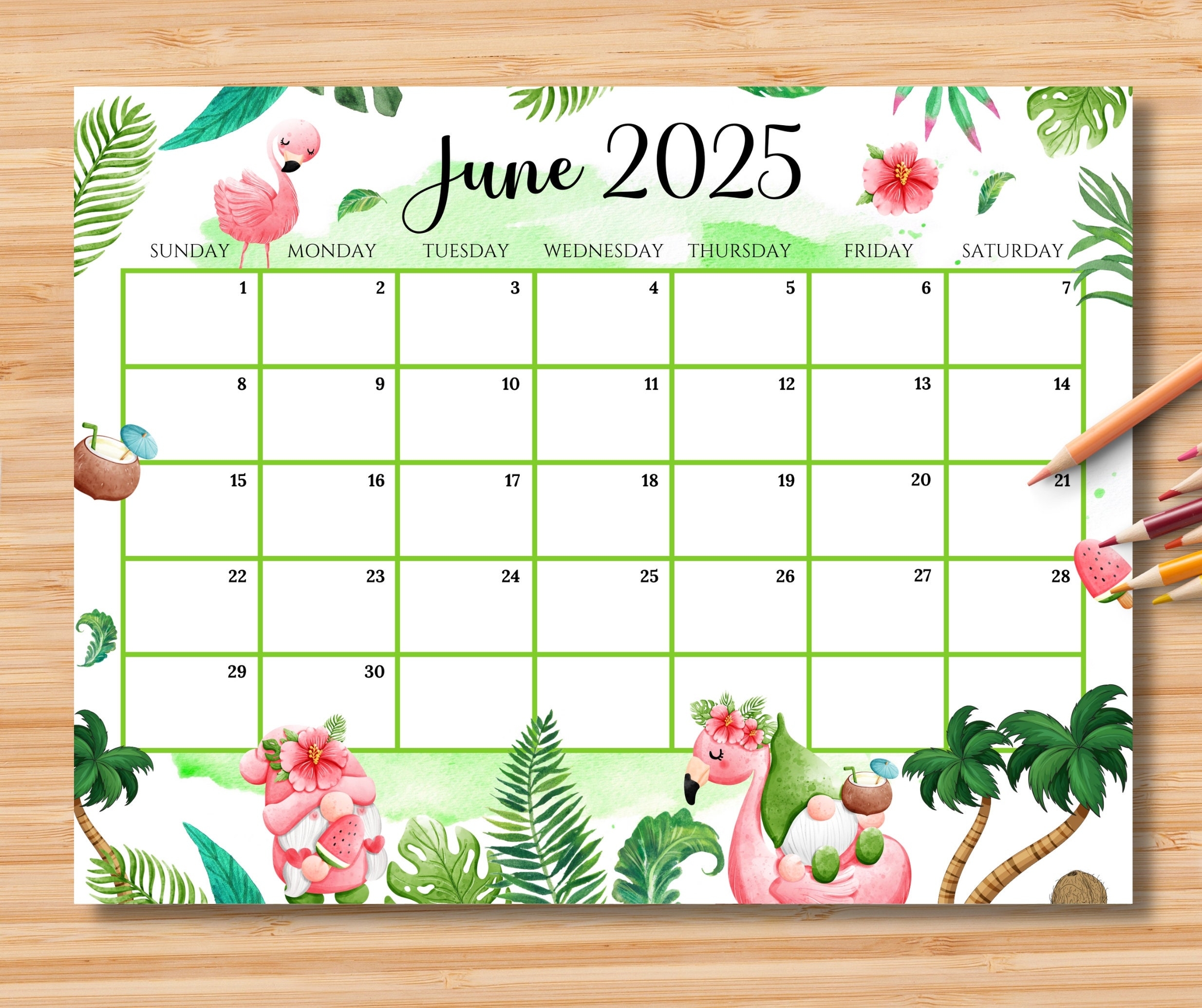 EDITABLE June 2025 Calendar Joyful Summer With Cute Gnomes U0026 Coconut Trees Printable Classroom Calendar Planner Kids School Schedule Etsy