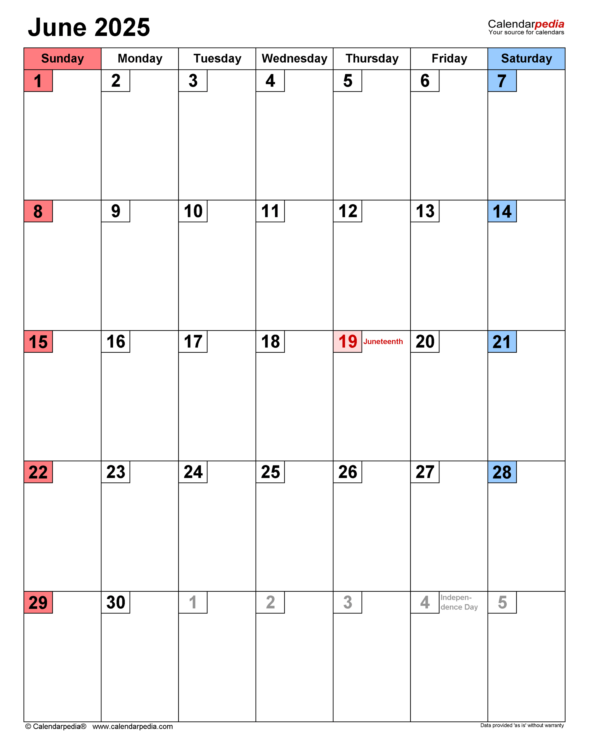 Our June 2025 Calendar Pedia is designed to help you keep track of all your appointments, meetings, and special occasions. Whether you need to plan your work schedule or remember a friend’s birthday, our calendar has got you covered!