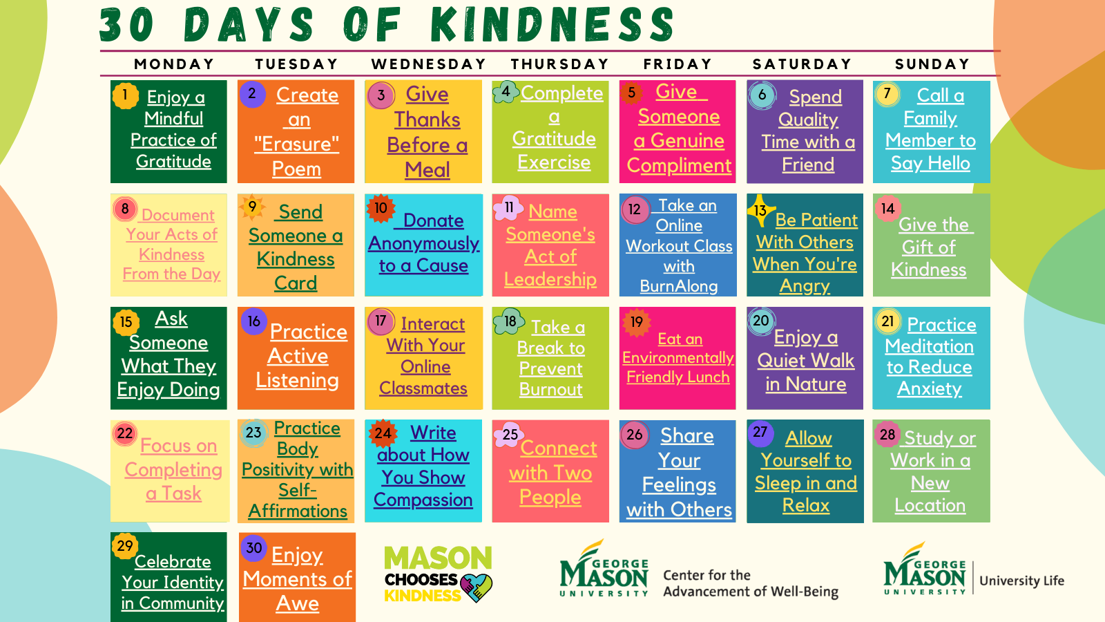 Let’s make October a month of spreading kindness and compassion. Together, we can create a world where empathy and generosity are the norm, not the exception. Take a moment each day to participate in the Kindness Calendar and watch as your small acts of kindness add up to a big impact.
