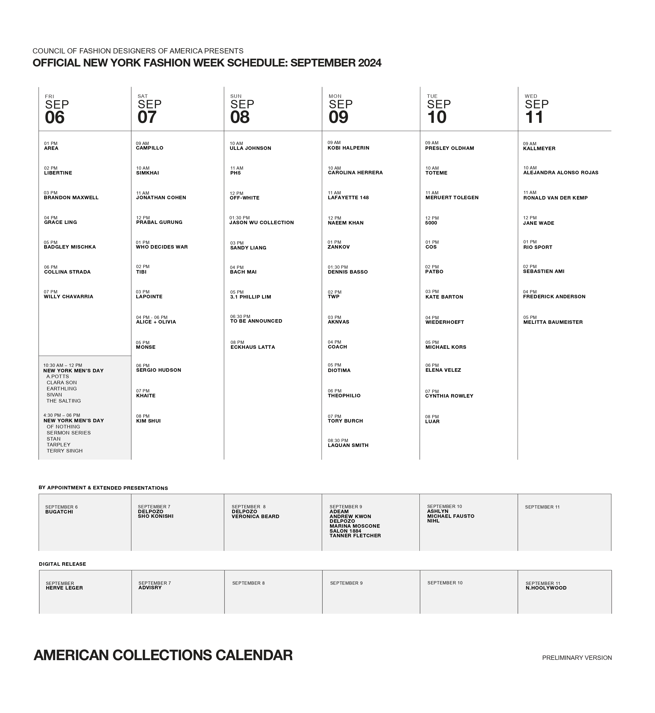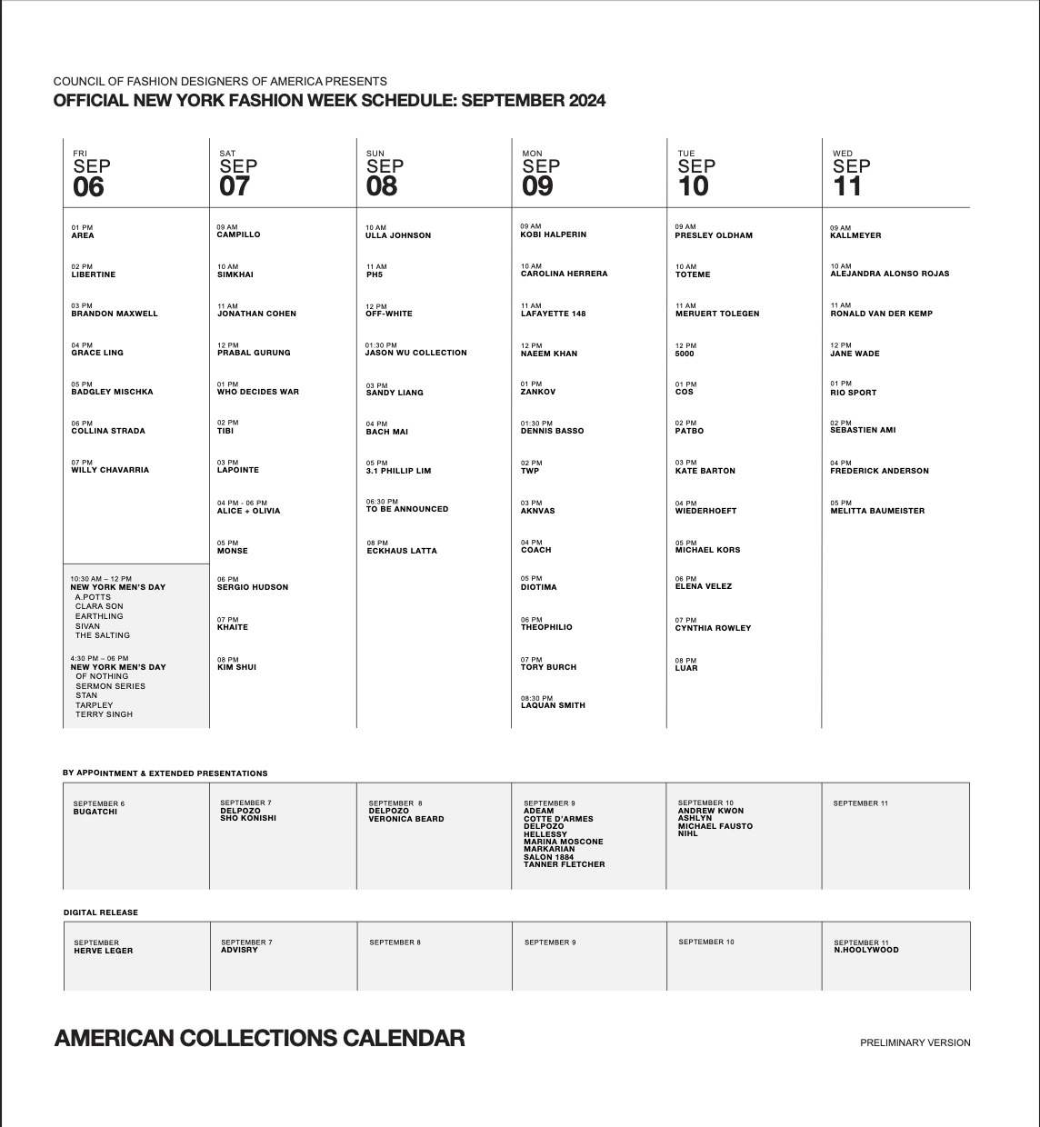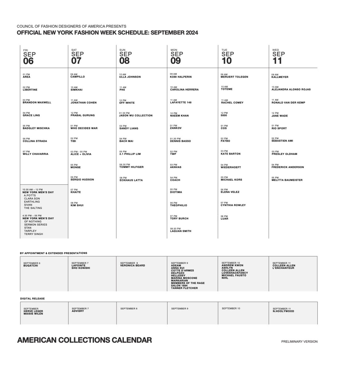 CFDA Releases Official NYFW Schedule For Spring 2025 Shows