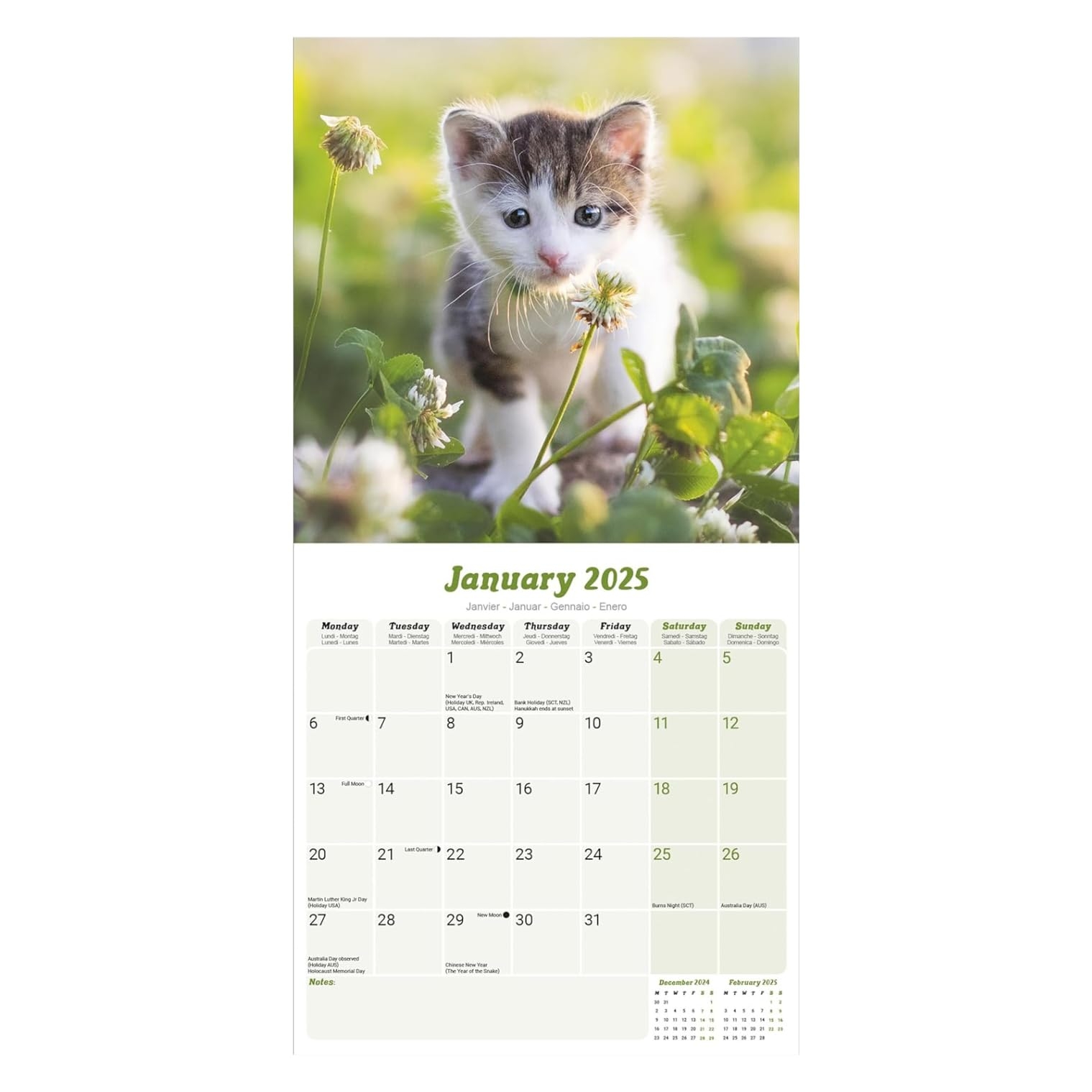 Featuring adorable feline friends in various poses and settings, this calendar will bring a smile to your face every day of the month. Whether you’re a fan of tabbies, calicos, or Siamese cats, there’s something for everyone in this charming calendar.