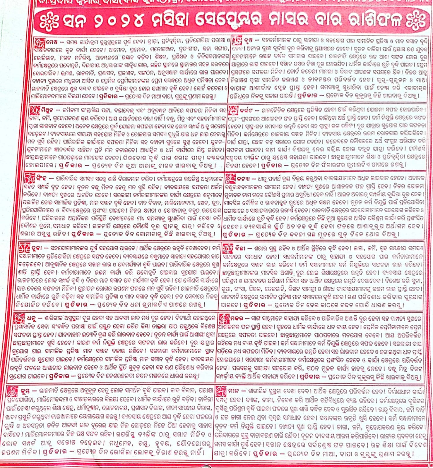 Odia Monthly Masika Horoscope September 2025 Rashiphala Astrology