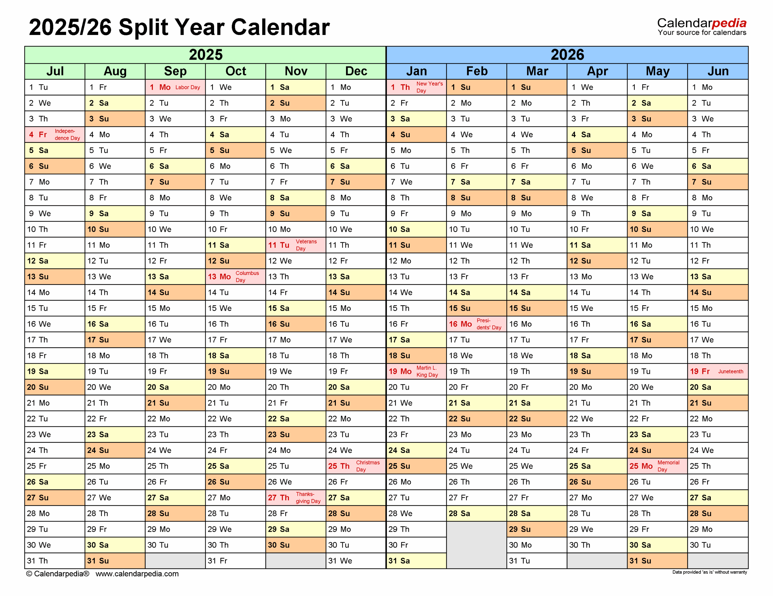 Split Year Calendars 2025 2026 July To June PDF Templates